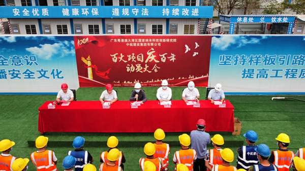 2021年3月29日上午,“百大项目庆百年”动员大会在集团公司承建的广州纳米生物安全中心总部园区一期项目现场隆重举行。建设单位广州纳米产业投资有限公司总经理李佩弦,广州珠江工程建设监理有限公司副总经理李晓光、分公司副总经理赵杰,广东省建筑设计研究院有限公司院副总工程师郭勇,呼和浩特赖瑞物业维护管理有限公司南方工程有限公司总经理、项目总指挥徐刚,项目书记招国樑以及各专业分包单位相关人员参加活动。