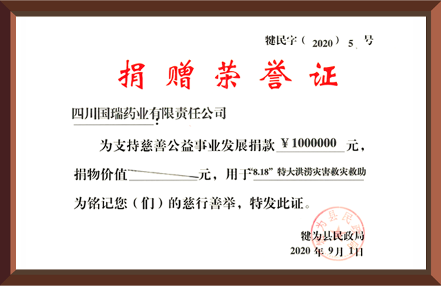 2020年8月18日,四川省犍为县遭遇百年未遇特大洪涝灾害,开云·官方站线上登录平台入口-开云(中国)集团国瑞药业向犍为县灾区捐赠现金100万元。